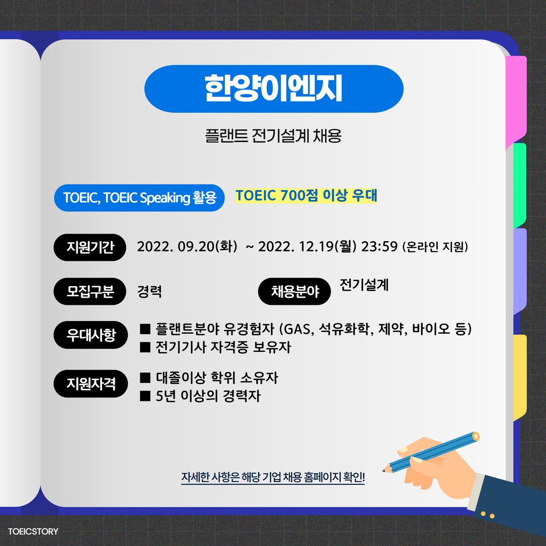 | 한양이엔지 | 경력 | 플랜트 전기설계 채용 | 12.19(월) 23:59 | TOEIC 700점 이상 우대 |