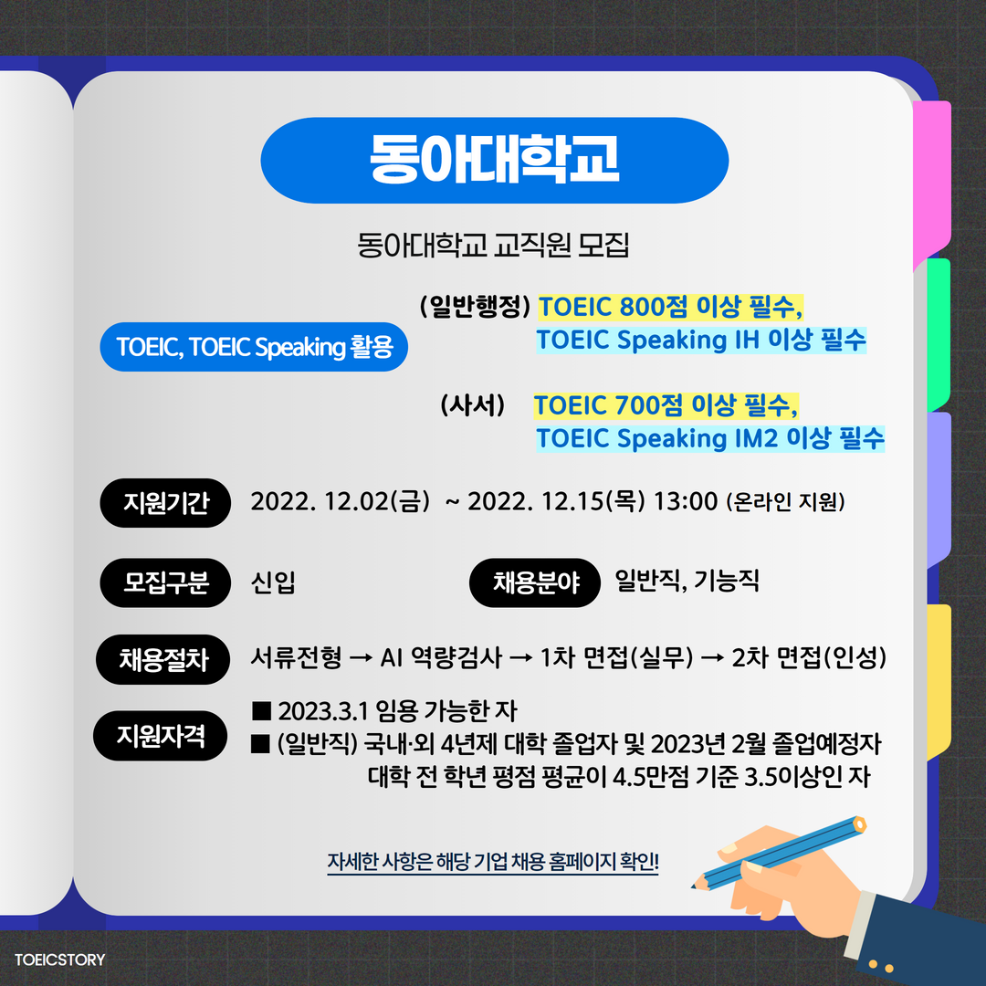 | 동아대학교 | 신입 | 동아대학교 교직원 모집 | 12.15(목) 13:00 | (일반행정) TOEIC 800점 이상 필수, TOEIC Speaking IH 이상 필수 (사서) TOEIC 700점 이상 필수, TOEIC Speaking IM2 이상 필수 |