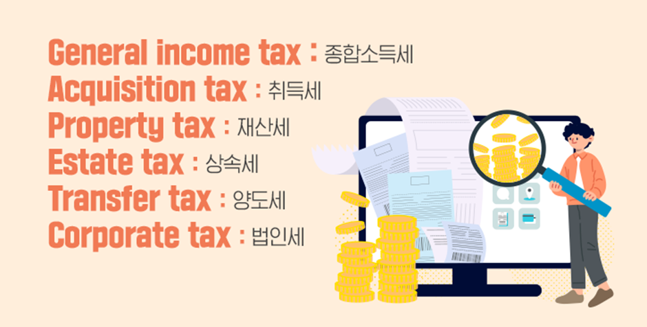 연말정산을 하다 보면 생각보다 다양한 세금의 종류에 놀랄 수도 있습니다. 먼저 ‘General income tax(종합소득세)’는 1년 동안 발생한 총소득에 대하여 매기는 세금을 의미합니다. 부동산, 자동차 등 재산을 취득하면 납부해야 하는 취득세는 ‘Acquisition tax’, 현재 보유 중인 재산에 부과되는 재산세는 ‘Property tax’라고 부른답니다.
