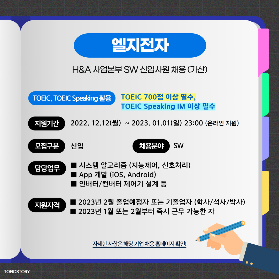 <토익스토리>가 SK텔레콤, LIG넥스원, 엘지전자 채용 정보를 안내해 드립니다. 모집 마감일과 토익, 토익스피킹 성적 기준을 확인해 보세요!