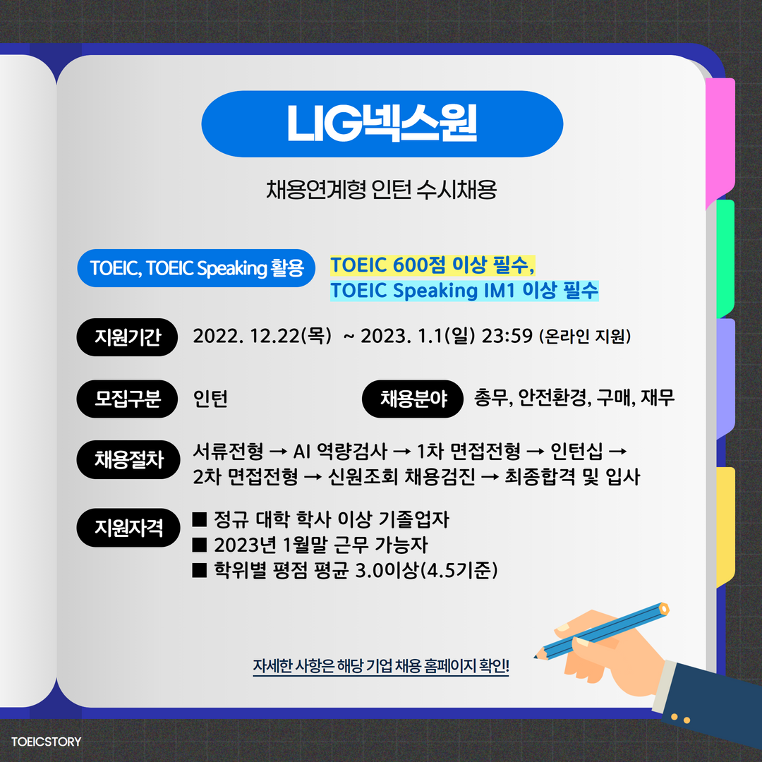 | LIG넥스원 | 인턴 | 2023년 상반기 채용연계형 인턴십 프로그램 | 01.01(일) 23:59 | TOEIC 600점 이상 필수, TOEIC Speaking IM1 이상 필수 |