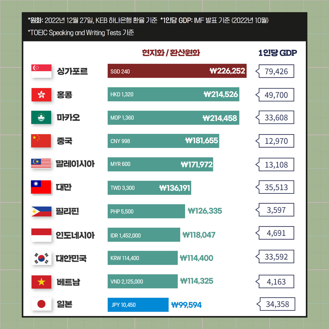 다른 나라의 토익 응시료는 얼마? TOEIC 시행 주요 국가별 응시료 현황 (2022년 12월)