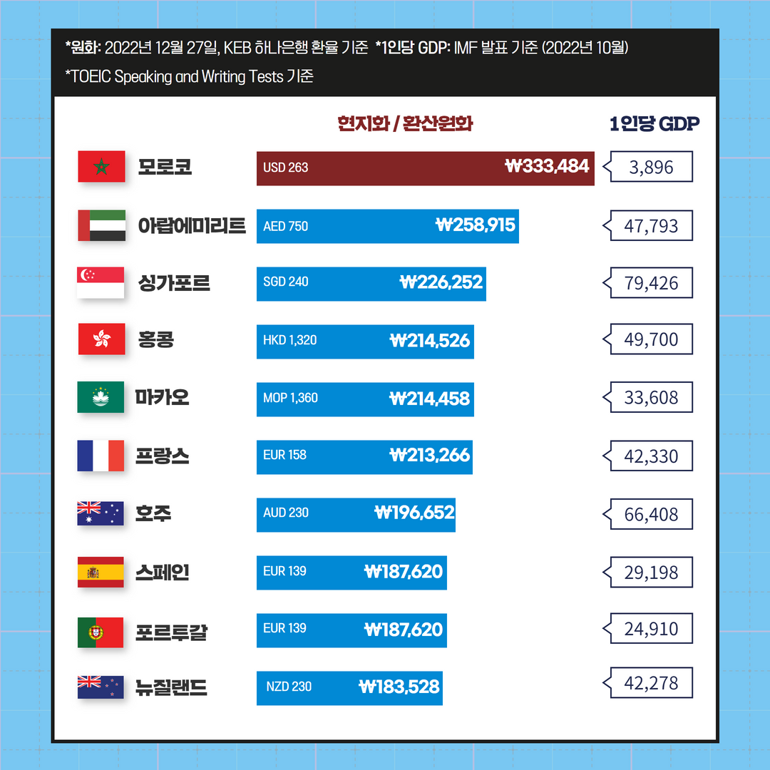 다른 나라의 토익 응시료는 얼마? TOEIC 시행 주요 국가별 응시료 현황 (2022년 12월)