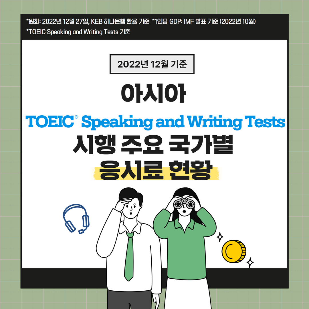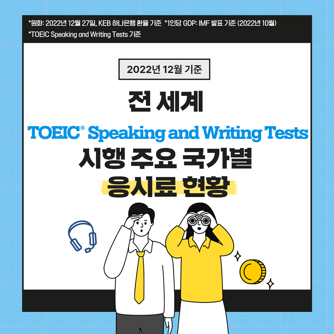 오늘은 <토익스토리>가 전 세계 TOEIC Speaking and Writing Tests를 시행하고 있는 주요 국가별 응시료 현황을 전해드립니다. 주목하세요! :)