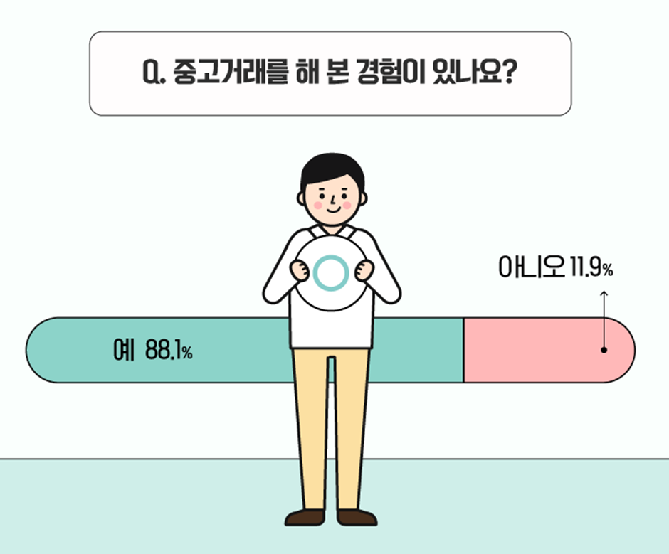최근 급격히 성장하고 있는 중고거래 시장, 실제로 중고거래를 해 보신 분들은 얼마나 있을까요? 중고거래 경험 유무를 묻는 질문에 무려 88.1%의 응답자가 ‘중고거래 경험이 있다’고 답변했습니다! 반대로 중고거래 미경험자는 11.9%로 확인되었습니다.