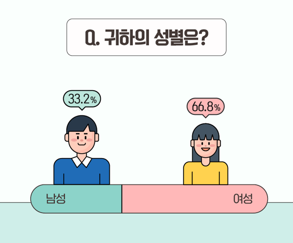 설문 참여자의 성비는 ‘여성’이 66.8%, ‘남성’이 33.2%로, 여성분들이 많이 참여해 주셨네요. :)