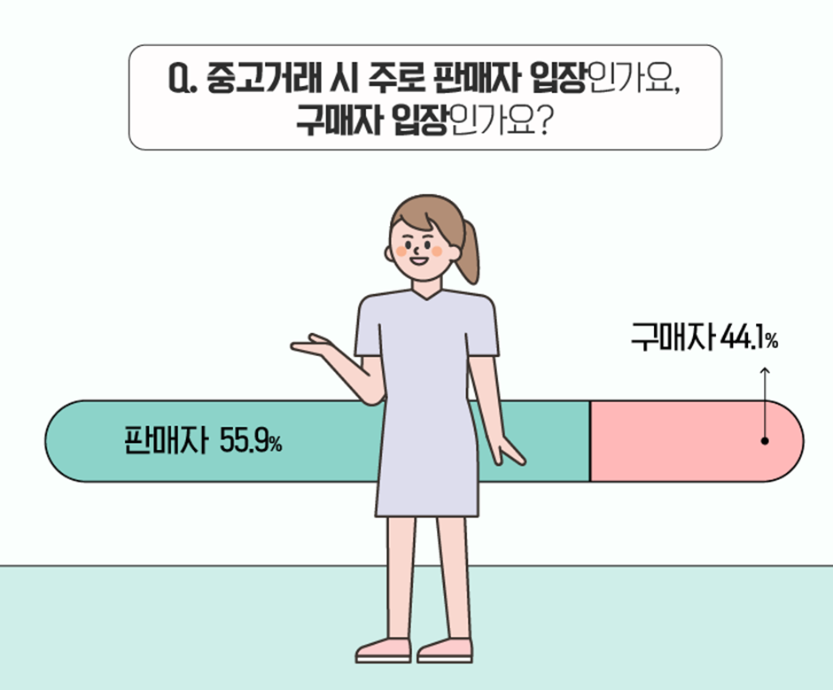 <토익스토리> 가족 여러분은 중고거래 시 판매자와 구매자 중 어떤 입장에 많이 계실까요? 응답자 10명 중 6명은 판매, 4명은 구매하는 편으로 나타났는데요. 두 선택지의 응답률 차이가 크지 않아, 판매와 구매 모두 활발하게 이루어지고 있는 것을 확인할 수 있습니다. :)