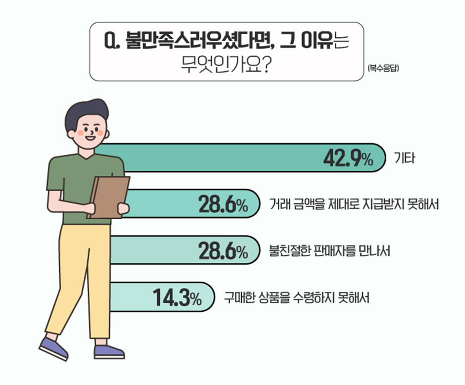 한편, 중고거래에 불만족한 분들의 의견은 어떨까요? 불만족에 대한 이유를 묻는 질문(복수응답)에 ‘거래 금액을 제대로 지급받지 못해서’라는 응답과 ‘불친절한 판매자를 만나서’라는 응답이 동일하게 28.6%를 차지했습니다. ‘구매한 상품을 수령하지 못해서’라는 응답도 14.3%를 기록했습니다.