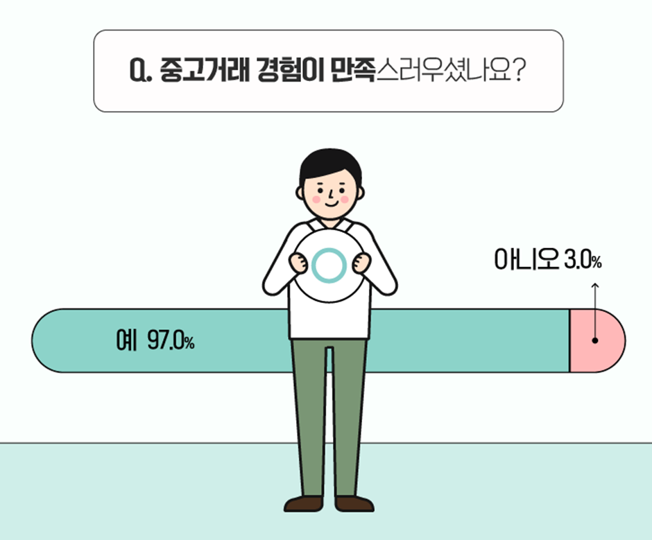 이어서 중고거래 경험에 대한 만족도를 확인해 봤습니다. 압도적인 비율인 97%로 응답자 대다수가 ‘만족스럽다’고 답했습니다!