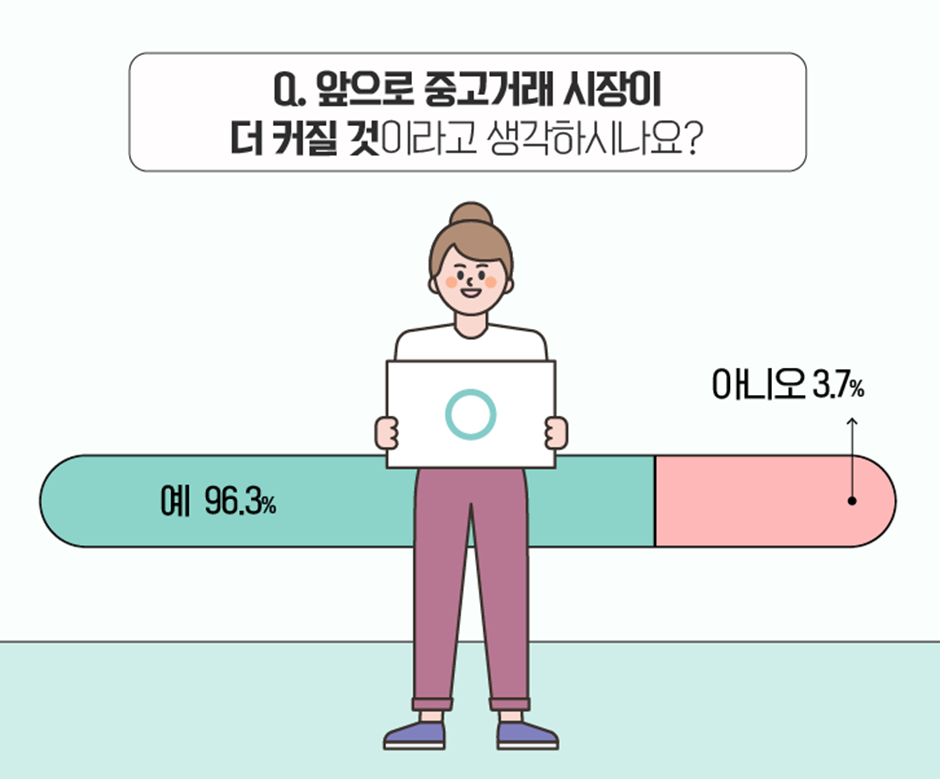 마지막으로 앞으로의 중고거래 시장의 전망에 대해 질문했는데요. 중고거래의 인기를 증명하듯, 중고거래 시장은 ‘더 커질 것이다’라는 답이 96.3%라는 높은 응답률을 기록했습니다. :)