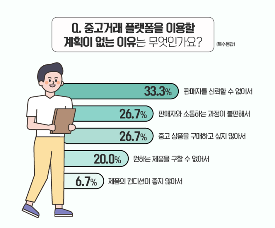 반면 중고거래 플랫폼을 다시 이용하고 싶지 않다고 응답한 분들께 그 이유를 물었습니다. ‘판매자를 신뢰할 수 없어서’라는 응답이 33.3%로 가장 높은 비율을 차지했습니다. 또, ‘판매자와 소통하는 과정이 불편해서(26.7%)’와 ‘중고 상품을 구매하고 싶지 않아서(26.7%)’라는 응답도 적지 않은 비율을 보였습니다.