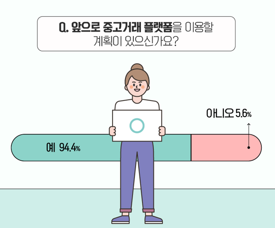 중고거래에 대한 높은 만족도와 같이, 앞으로 중고거래 플랫폼을 이용할 계획도 매우 높은 수치로 확인되었습니다! 무려 94.4%의 응답자가 ‘앞으로 ‘중고거래 플랫폼을 이용할 계획이 있다’라고 답변했네요. :)