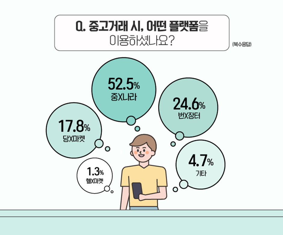 중고거래 시, 소비자들은 주로 어떤 플랫폼을 이용할까요?(복수응답) 과반수가 넘는 응답자들이 ‘중X나라(52.5%)’라고 답했고, 뒤를 이어 ‘번X장터(24.6%)’와 ‘당X마켓(17.8%)’ 이용자들이 많이 확인되었습니다. 이 외에도 ‘헬X마켓’이 1.3%를 기록했네요.