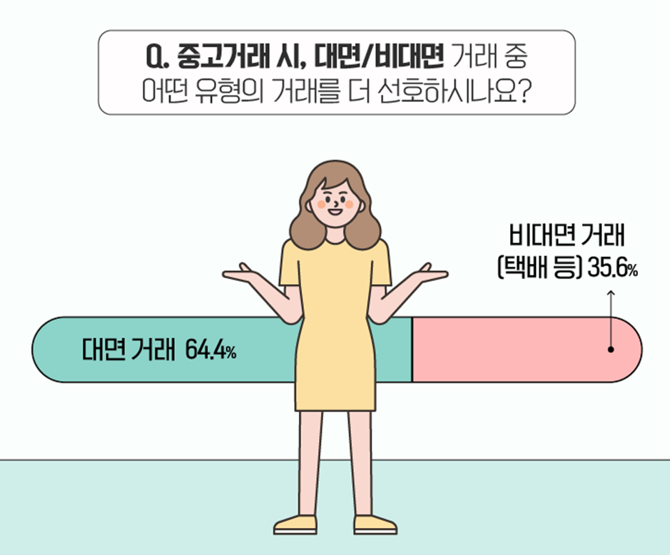 여러분은 중고거래 시, 대면 거래 혹은 비대면 거래 중 어떤 쪽을 선호하시나요? :) 설문 조사 결과, 64.4%의 응답자가 직접 얼굴을 마주하는 ‘대면 거래’를 선호한다고 답변했습니다. 반면, 택배 등을 이용해 물건을 주고받는 ‘비대면 거래’도 35.6%로 나타났습니다. 아무래도 대면 거래를 진행하면 직접 물품을 확인할 수 있어, 조금 더 많은 분들이 대면 거래를 선호하시는 것으로 생각되네요. :)