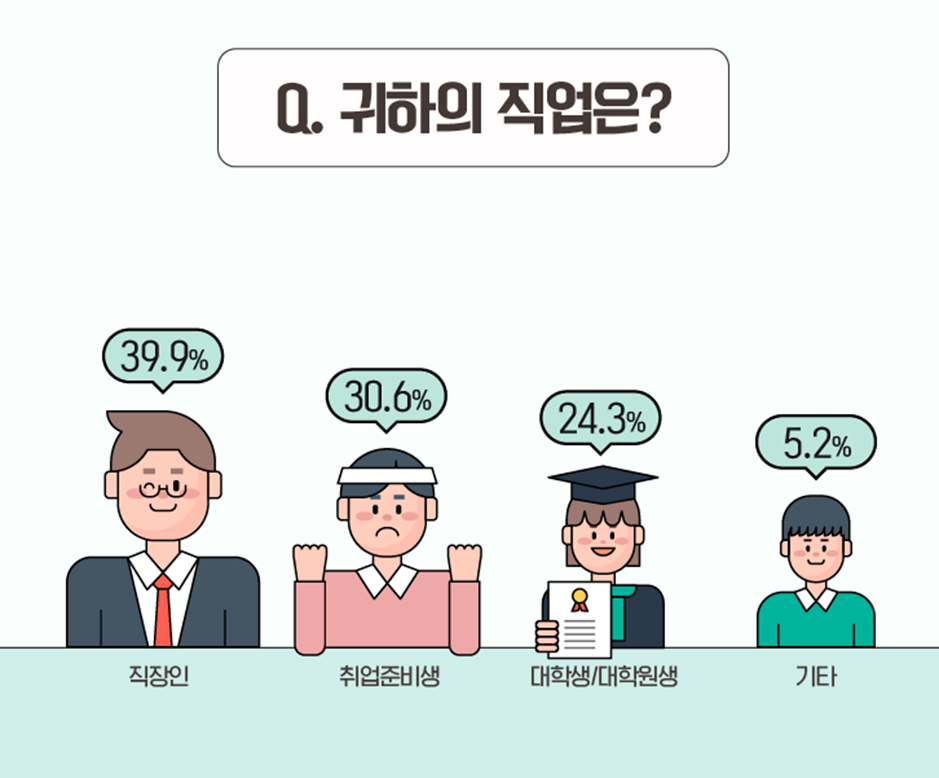 설문 참여자의 직업은 ‘직장인’이 39.9%로 가장 높은 비율을 차지했으며, ‘취업준비생’이 30.6%로 그 뒤를 이었습니다. 다음으로 ‘대학생/대학원생’이 24.3%, ‘기타’ 직업군에 속한 응답자는 5.2%로 집계되었습니다.
