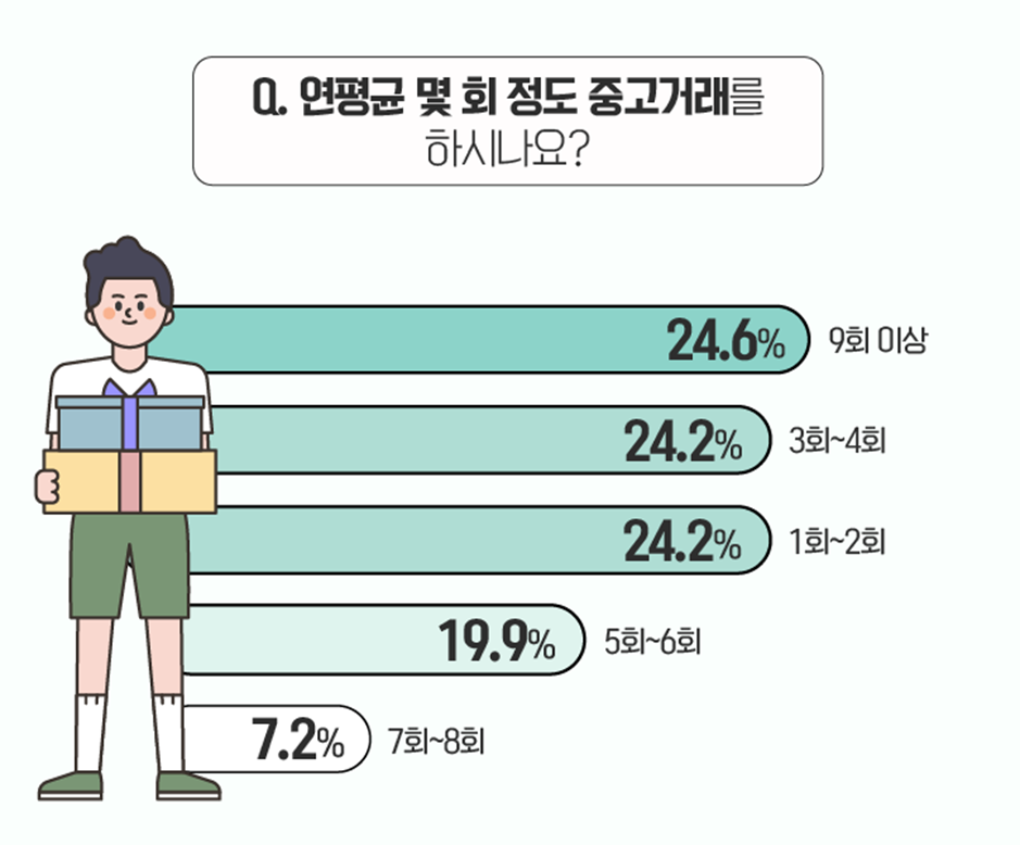 중고거래를 하는 ‘빈도’에 대해서는 비교적 다양한 답변이 고르게 나타났는데요. 먼저, 연평균 ‘9회 이상’ 중고거래를 한다는 응답자가 24.6%로 가장 많았습니다. 5주에 한번 꼴로 중고거래를 하는 셈이겠네요!