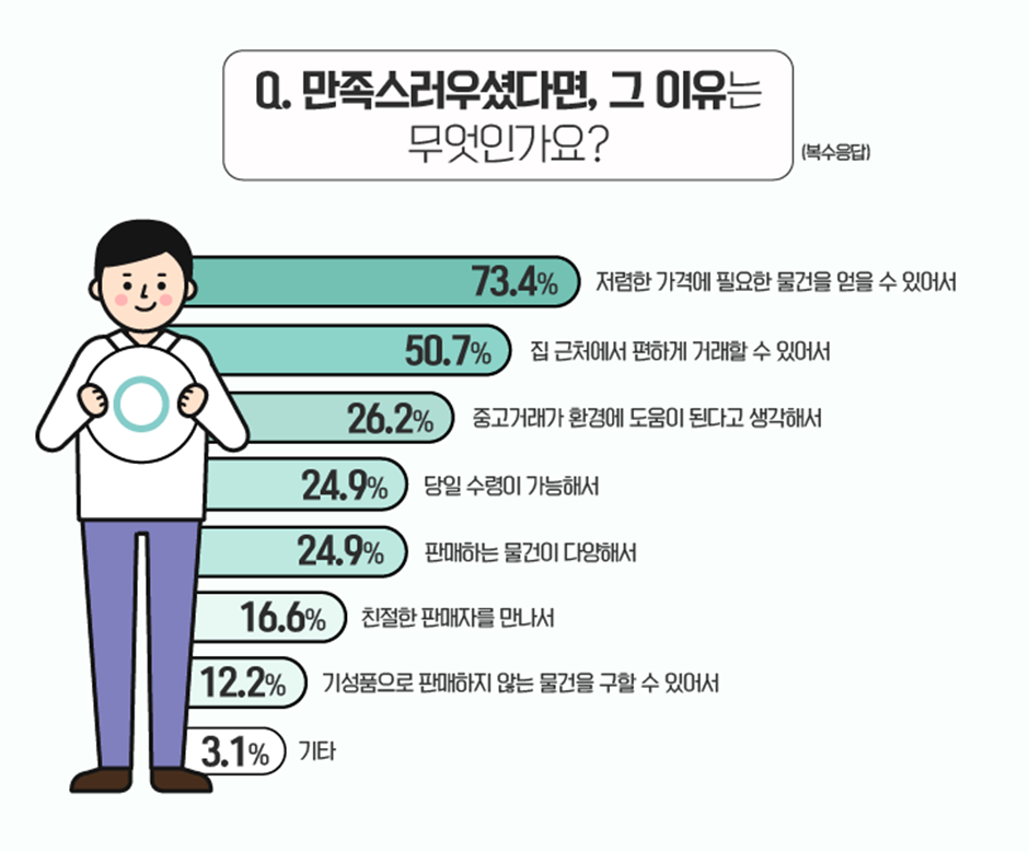 중고거래에 대해 만족스럽다고 답하신 분들을 대상으로 그 이유에 대해 물었습니다(복수응답). 중고거래 만족도에 대한 요인은 ‘저렴한 가격에 필요한 물건을 얻을 수 있어서’가 73.4%로 1위를 차지했습니다! 경제적인 이유가 가장 크다고 볼 수 있겠네요. :)
