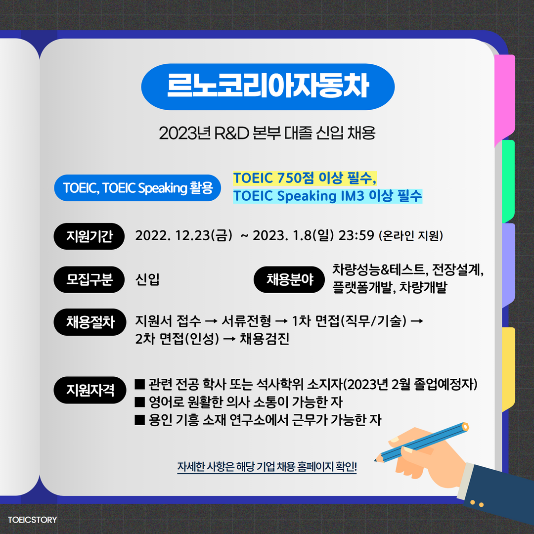 | 르노코리아자동차 | 신입 | 2023년 R&D본부 신입사원 채용 | 1.8(일) 23:59 | TOEIC 750점 이상 필수, TOEIC Speaking IM3 이상 필수 |
