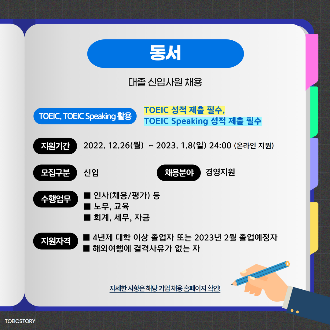 | 동서 | 신입 | 대졸 신입사원 채용 | 1.8(일) 24:00 | TOEIC 성적 제출 필수, TOEIC Speaking 성적 제출 필수 |