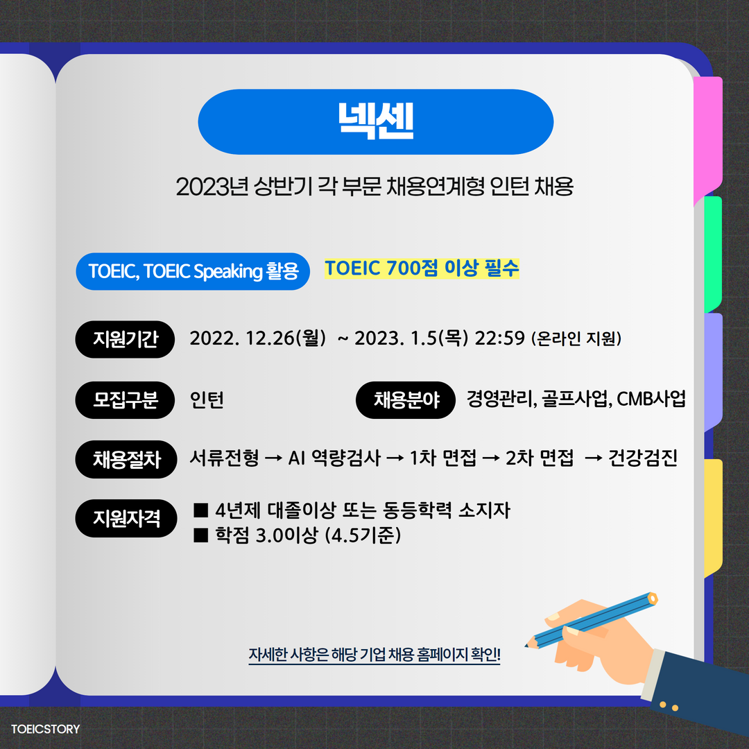 | 넥센 | 인턴 | 2023년 상반기 각 부문 채용연계형 인턴 모집 | 1.5(목) 22:59 | TOEIC 700점 이상 필수 |