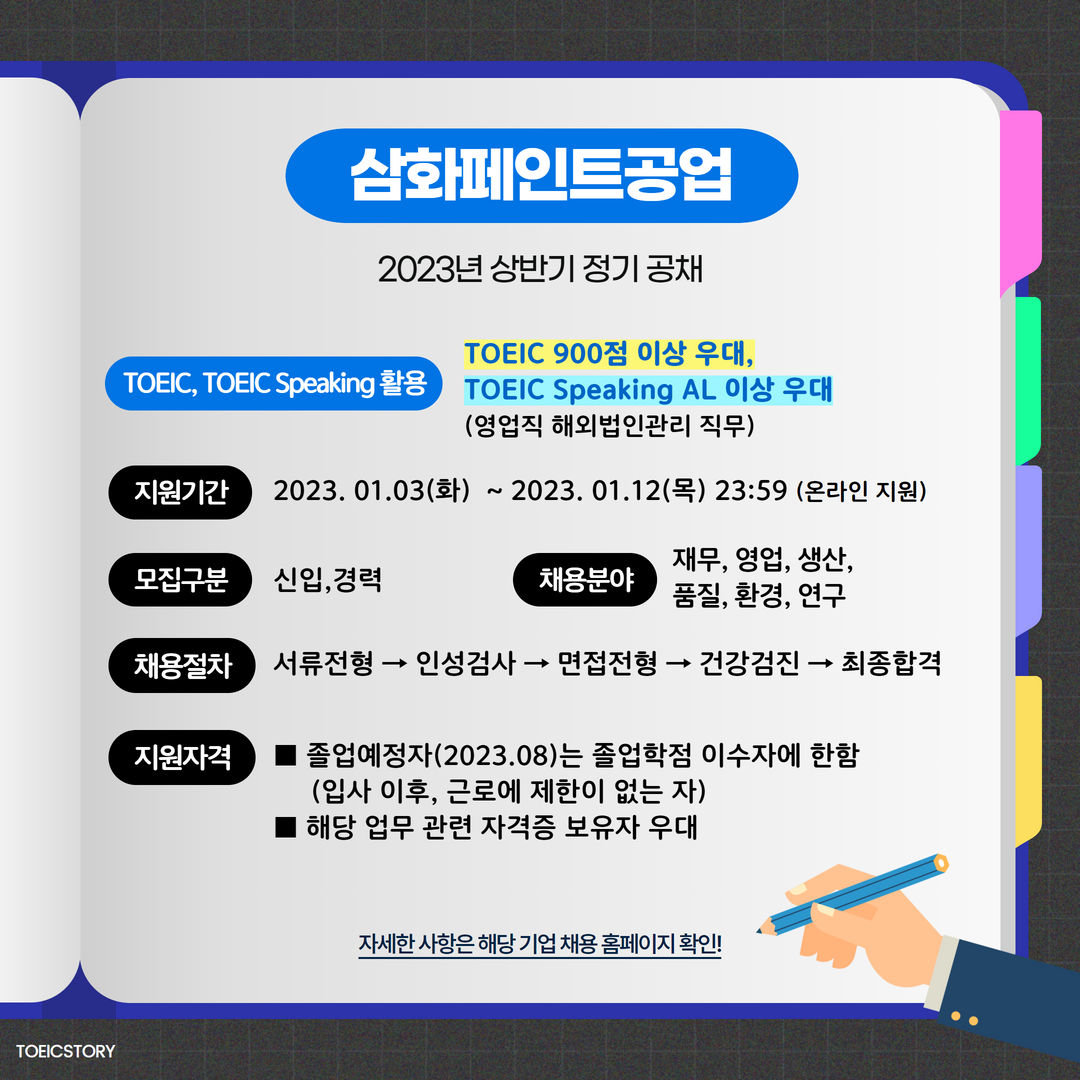 | 삼화페인트공업 | 신입/경력 | 2023년 상반기 정기 공채 | 1.12(목) 23:59 | TOEIC 900점 이상 우대, TOEIC Speaking AL 이상 우대 (영업직 해외법인관리 직무) |