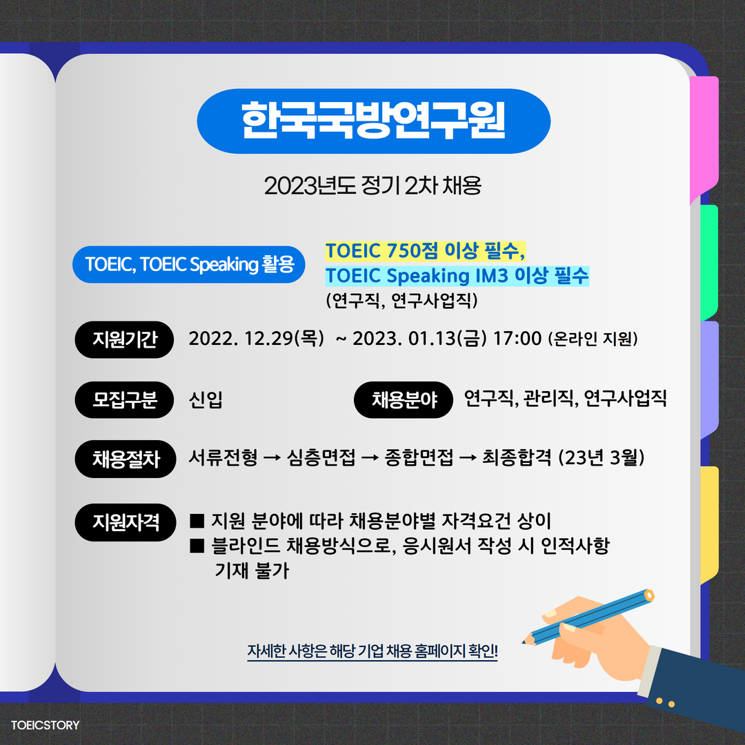 | 한국국방연구원 | 신입 | 2023년도 정기 2차 채용 공고 | 1.13(금) 17:00 | TOEIC 750점 이상 필수, TOEIC Speaking IM3 이상 필수 |
