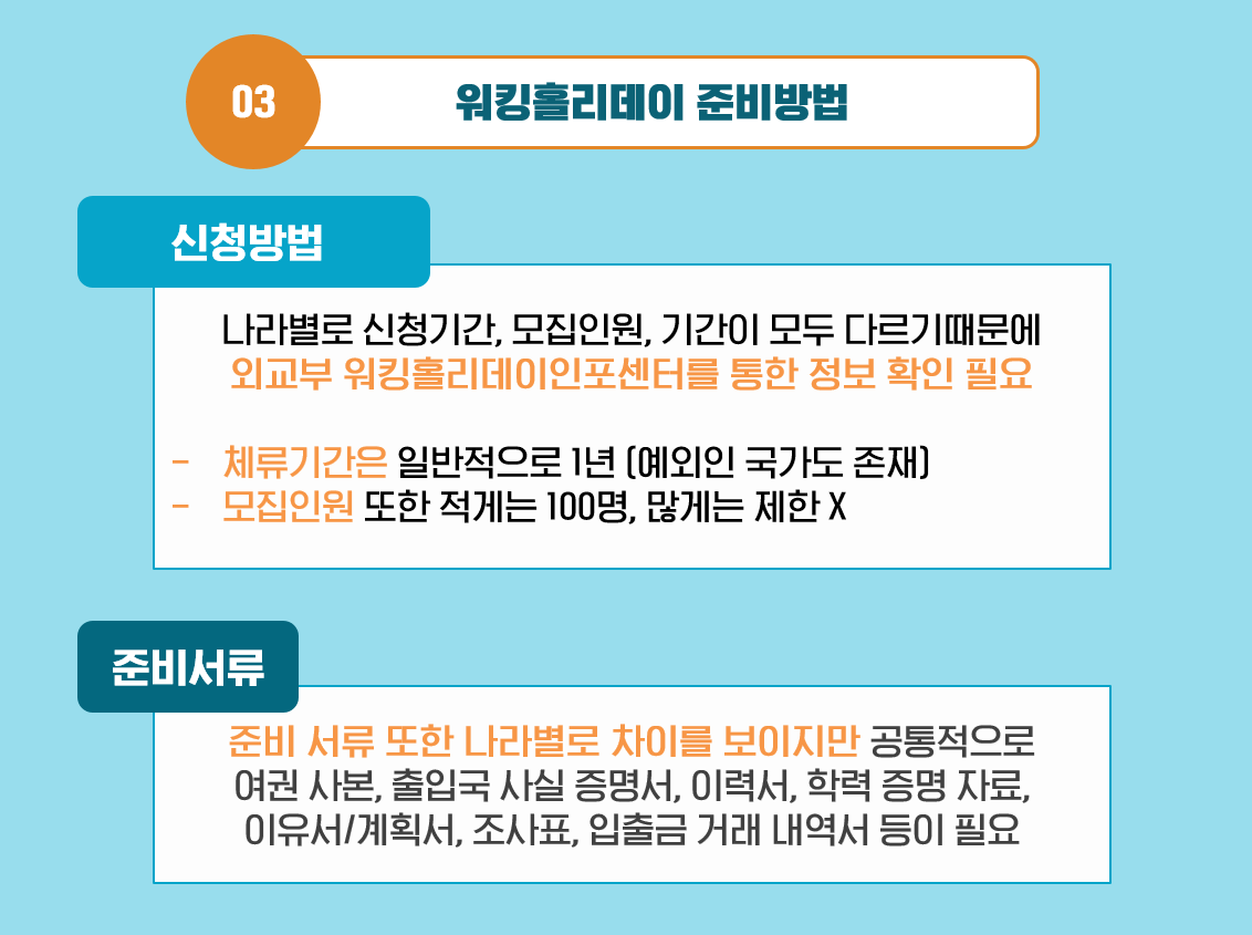 A3. 나라 별로 신청 기간, 모집 인원, 제한 기간이 모두 다르기 때문에 외교부 ‘워킹홀리데이 인포센터’를 통해 정확한 정보를 확인하는 것을 추천드립니다.