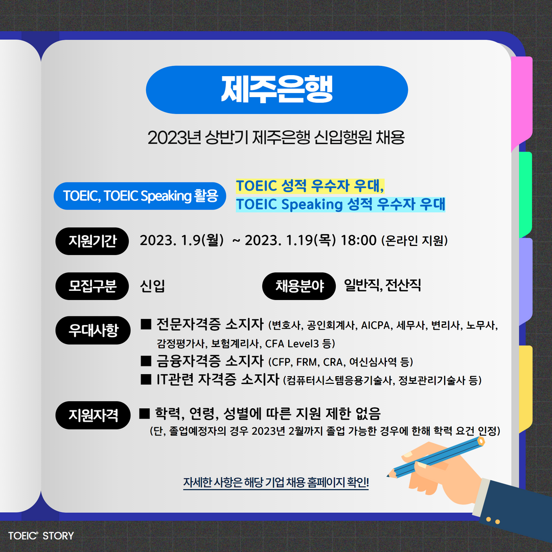 | 제주은행 | 신입 | 2023년 상반기 제주은행 신입행원 채용공고 | 1.19(목) 18:00 | TOEIC 성적 우수자 우대, TOEIC Speaking 성적 우수자 우대 |