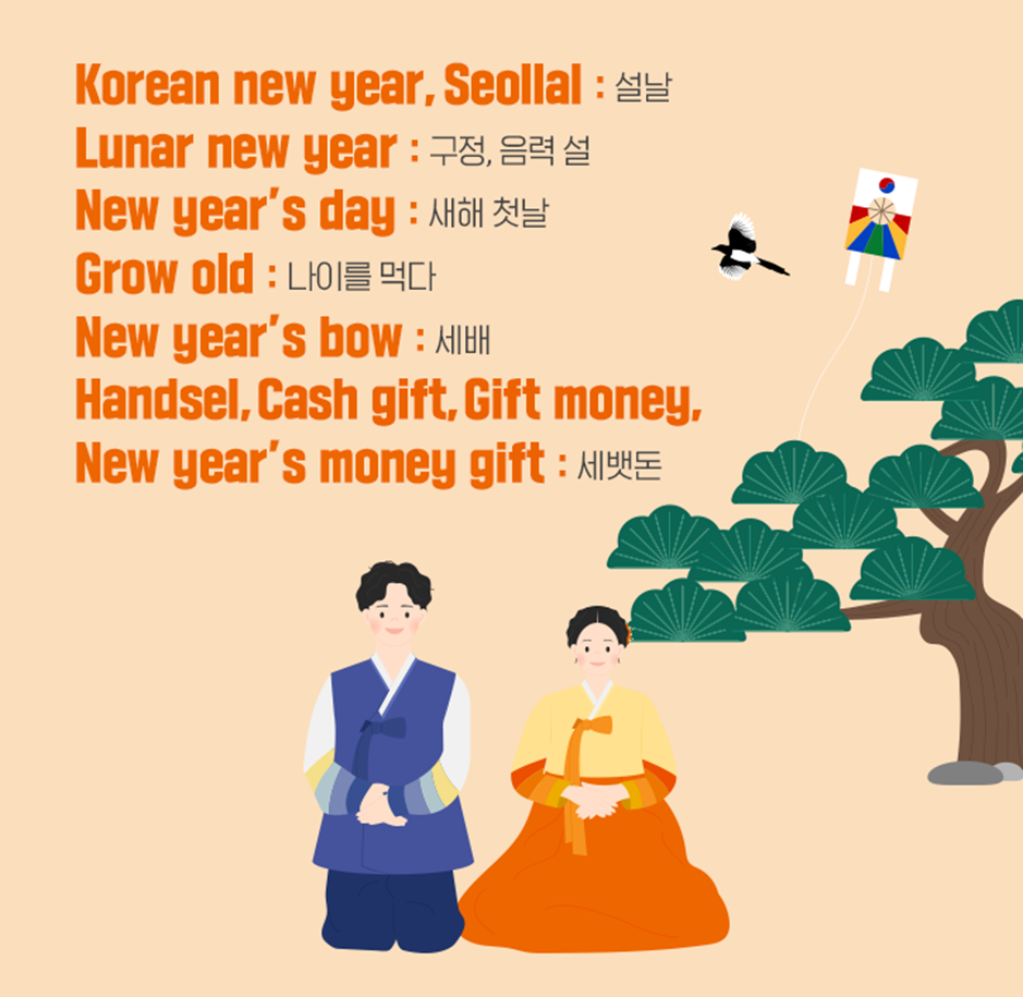 한국의 설날은 ‘Korean new year’라고 합니다. ‘설’이라는 단어와 한국 설의 고유한 풍습은 우리나라에만 있기 때문에 ‘new year(새해)’에 ‘Korean’을 붙이는 것이죠. 발음 그대로 'Seollal'이라고 말하기도 한답니다! 우리가 쇠는 설은 새해 첫날이 아닌 구정, 즉 음력 1월 1일입니다. 따라서 ‘음력’이라는 뜻의 ‘lunar calendar’의 ‘lunar’를 사용해 ‘lunar new year’라고 표현하기도 합니다. 우리나라와 중국을 제외한 많은 나라에서는 양력 1월 1일을 ‘new year’s day’로 기념하고 있답니다.