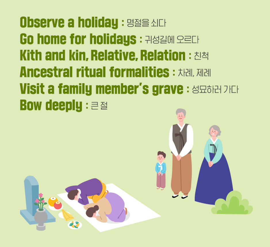 우리나라는 유교 사상의 영향을 받은 관습들이 많이 있습니다. 대표로 명절에 ‘차례’를 지내는 것인데요. 차례는 영어로 ‘의식 절차, 의례’를 뜻하는 ‘ritual’과 ‘조상’을 의미하는 ‘ancestral’을 합쳐 ‘ancestral ritual formalities’라고 표현할 수 있겠습니다. 또 하나의 관습은 명절에 조상의 산소를 찾아가는 ‘성묘’입니다. 성묘는 ‘가족의 산소를 찾아가다’라는 뜻의 ‘visit a family member's grave’라고 할 수 있습니다. 서양에서는 산소를 찾아 간단히 묵념을 하지만, 우리나라에서는 성묘를 가면 조상님들께 ‘bow deeply(큰 절)’하며 예의를 표하죠.