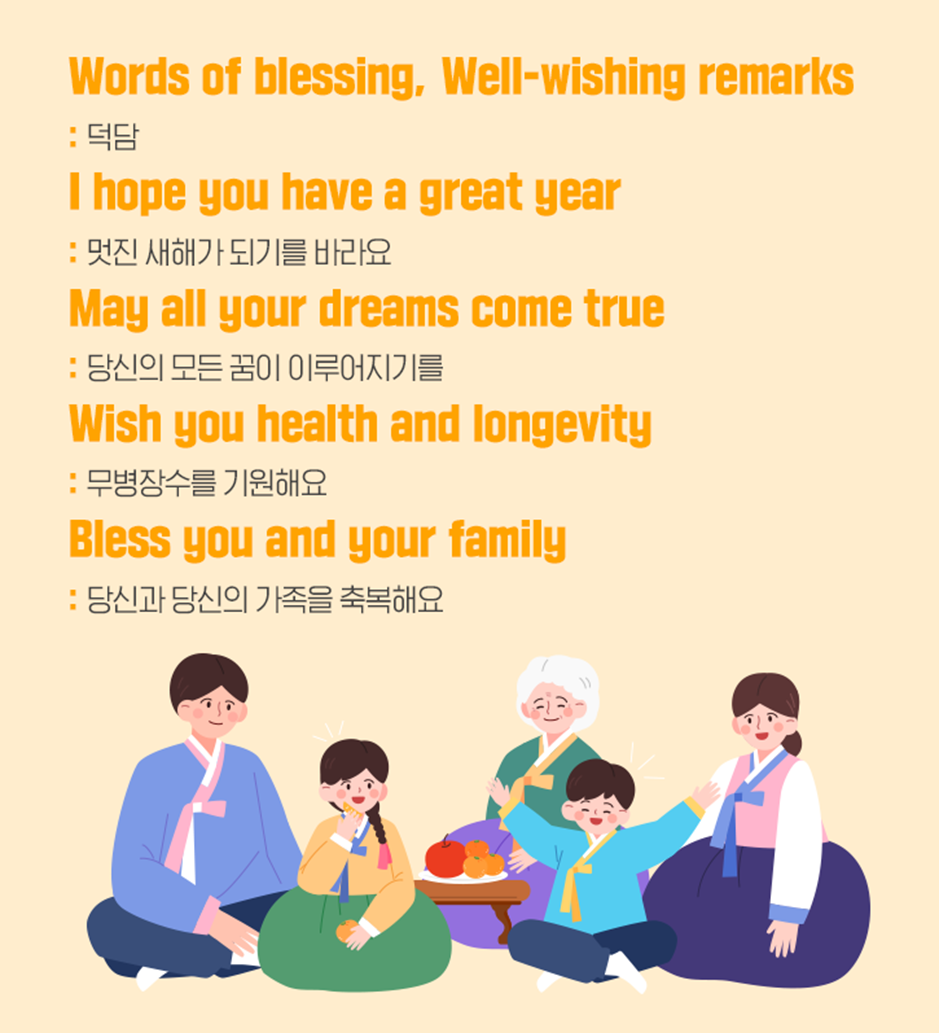 설에는 가족들과 새해에도 모든 일이 잘 풀리길 기대하며 덕담을 주고받습니다. 덕담은 영어로 ‘words of blessing’ 혹은 ‘well-wishing remarks’라고 합니다. 두 표현을 직역하면 ‘축복의 말’과 ‘행복을 비는 말’인데요. 이처럼 축복과 행복을 비는 마음을 가득 담아 덕담을 주고받으면 마음이 저절로 훈훈해지죠. :)