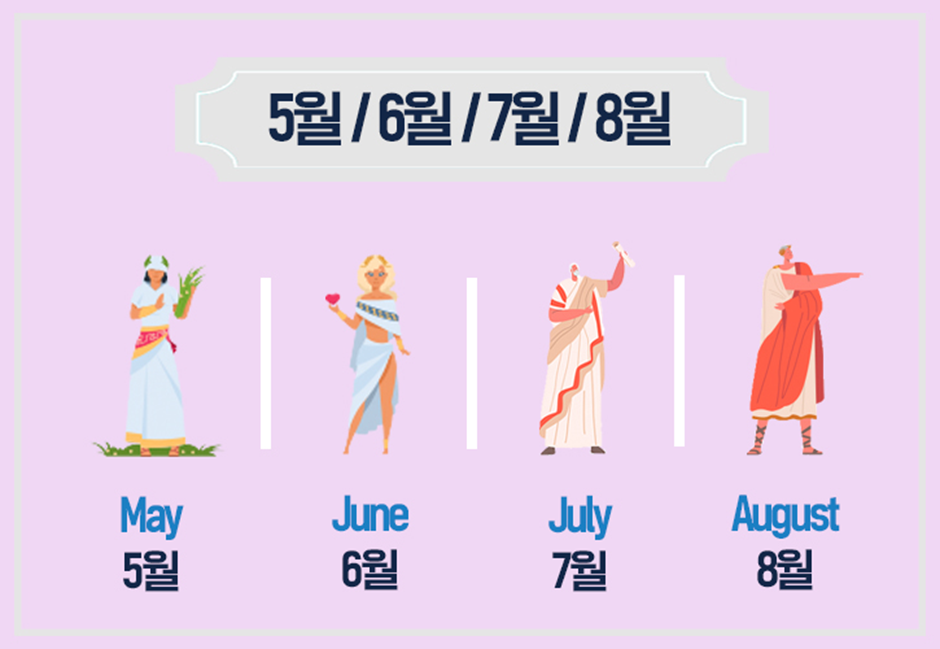 6월을 뜻하는 ‘June’ 또한 어원에 대한 여러 이야기가 있는데요. 가장 대표적인 것은 로마 신화의 여신 ‘주노(Juno)’로부터 유래되었다는 것입니다. 주노는 가정과 결혼을 보호하는 여신으로, 우리에게는 그리스 로마 신화의 ‘헤라(Hera)’로 더욱 잘 알려져 있죠. 서양에는 6월의 신부인 주노의 가호를 받아 더욱 행복하게 살 수 있다는 설이 있어, 6월에 결혼하는 부부가 많다고 하네요. :)