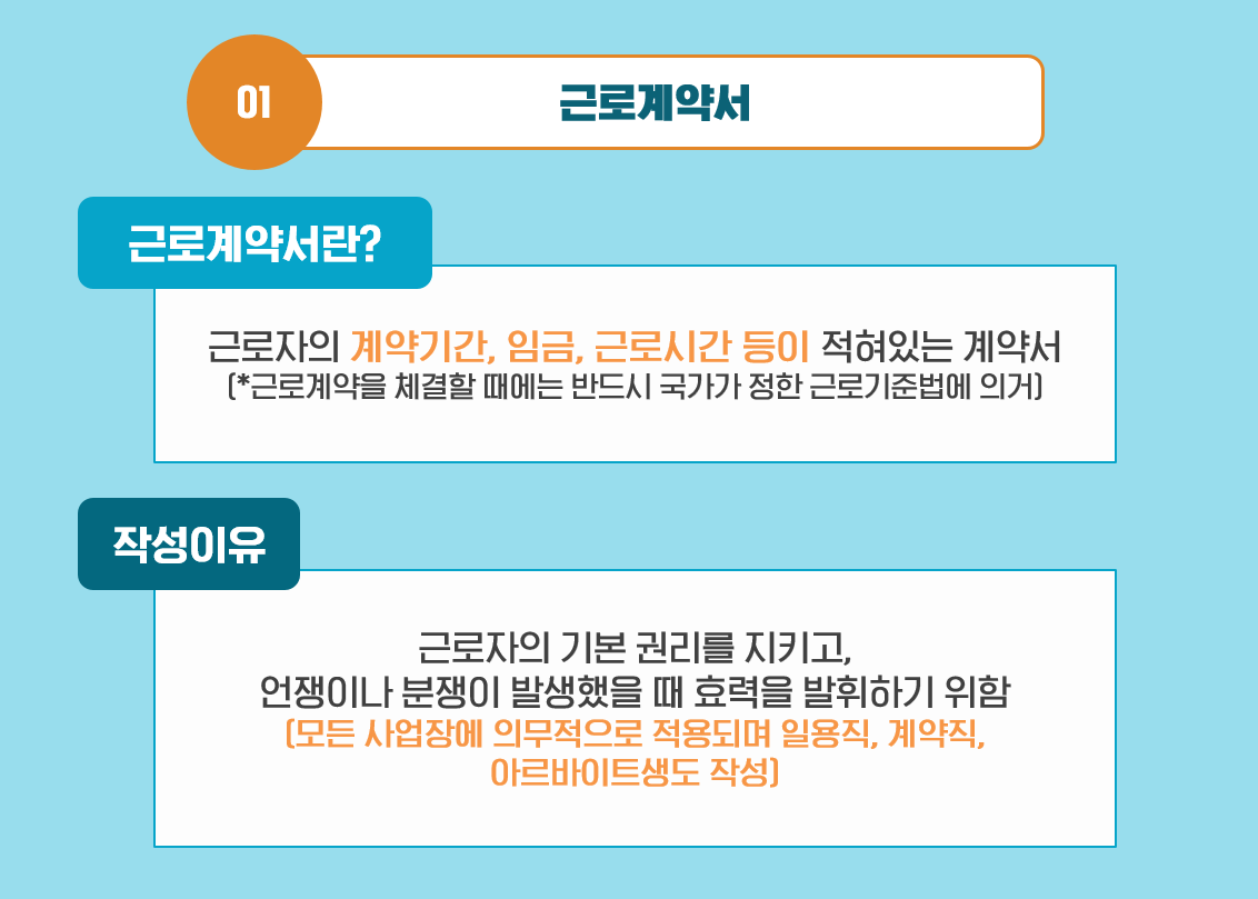 근로계약서 작성은 근로자로서의 기본적인 권리뿐만 아니라 분쟁이나 언쟁이 발생했을 때 그 효력을 발휘하기도 하는데요. 때문에 근로계약서 작성은 사업주와 근로자 모두에게 중요한 절차입니다. 따라서 업체 규모와 근로 시간에 관계없이 일용직, 계약직, 아르바이트생도 필수적으로 근로계약서를 작성해야 합니다. :)