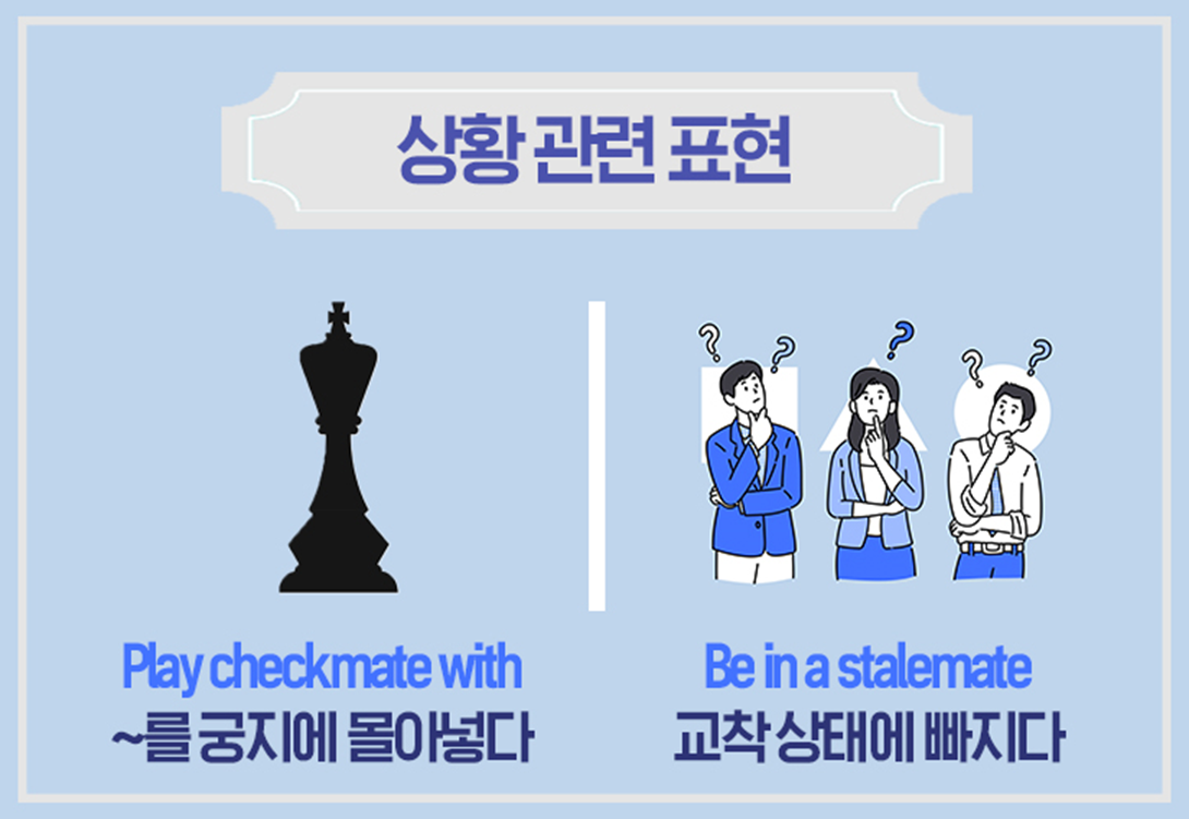 또 ‘스테일메이트(stalemate)’라는 표현도 체스에서 자주 등장하는데요. 게임 도중 상대편 말에 막혀 움직일 수 없는 상태를 스테일메이트라고 합니다. 일상에서도 어떤 상황에 진전이 없거나, 문제가 해결되지 않는 상황을 ‘교착 상태’라 부르죠. 따라서 ‘교착 상태에 빠지다’라고 말하고 싶다면, ‘be in a stalemate’라고 하면 된답니다. :)