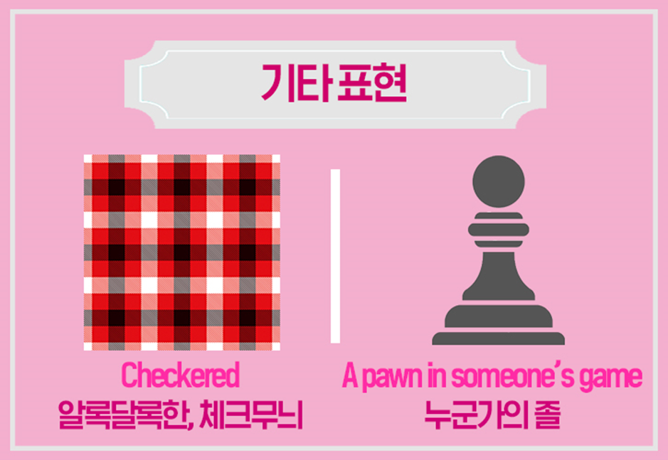 체스를 두는 판을 ‘체스보드(chessboard)’라고 합니다. 체스보드는 검은색과 하얀색이 교차로 번갈아 나타나는 모습을 하고 있죠. 이러한 체스보드에서 우리가 아는 ‘체크무늬’라는 표현이 생겨났습니다. 하지만 원래 체크무늬는 ‘check’가 아니라 ‘checkered’가 맞는 표현인 거 알고 계셨나요? ‘checkered’라는 단어가 ‘알록달록한, 체크무늬’라는 뜻을 가지고 있답니다. 앞으로는 ‘check shirt’가 아니라 ‘checkered shirt’라고 해보는 건 어떨까요? :)