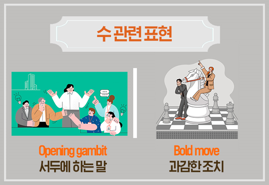 장기, 바둑과 같은 게임에서 수를 놓을 때 ‘move’라는 단어를 사용합니다. 게임을 하다 보면, 예상하지 못한 상대방의 대담한 수에 놀라기도 하죠. 이럴 때는 ‘move’와 ‘용감한, 대담한’이라는 뜻을 가진 ‘bold’를 함께 써 ‘bold move(대담한 수)’라고 표현합니다. 일상생활에서 갑자기 뜻밖의 일을 하거나, 과감한 행동을 하는 사람들에게 ‘과감한 조치를 취한다’는 의미로도 사용할 수 있답니다.