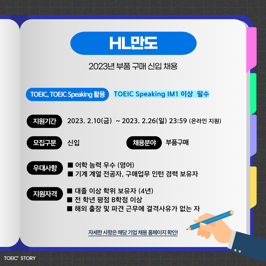 HL만도 신입 2023년 부품 구매 신입 채용 2.26(일) 23:59 TOEIC Speaking IM1 이상 필수
