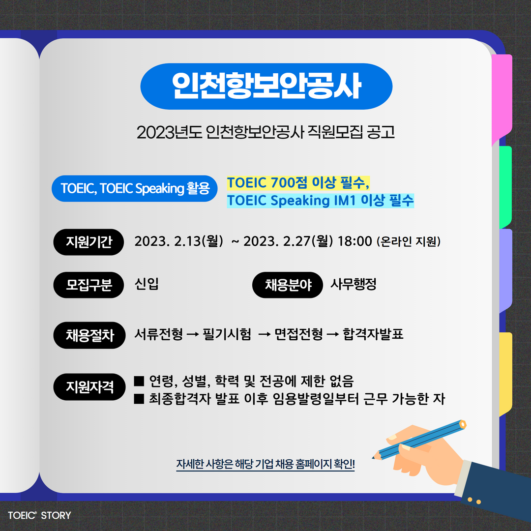 인천항보안공사 신입 2023년도 인천항보안공사 직원모집 공고 2.27(월) 18:00 TOEIC 700점 이상 필수,