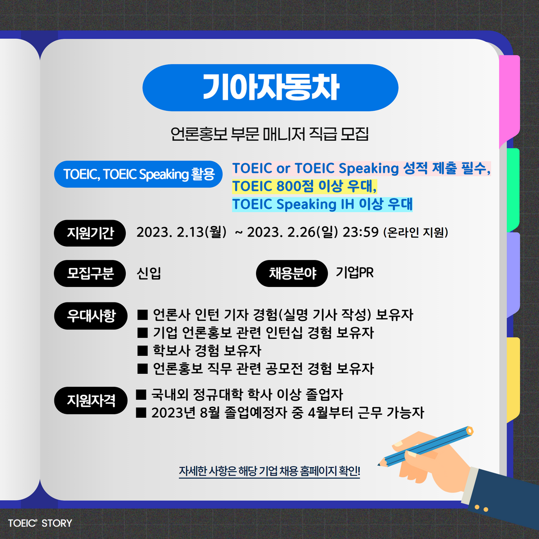 기아자동차에서 언론홍보 부문 매니저를 모집합니다. 합격자는 매체 취재활동 지원, 매체 대상 행사 지원, 매체 네트워크 관리와 기업/제품/마케팅에 대한 홍보콘텐츠 기획 및 작성 등의 업무를 담당하게 됩니다. 모든 지원자는 토익 또는 토익스피킹 성적 제출이 필수입니다! 더불어 토익 800점, 토익스피킹 IH 이상의 성적을 제출하면 우대받을 수 있습니다.