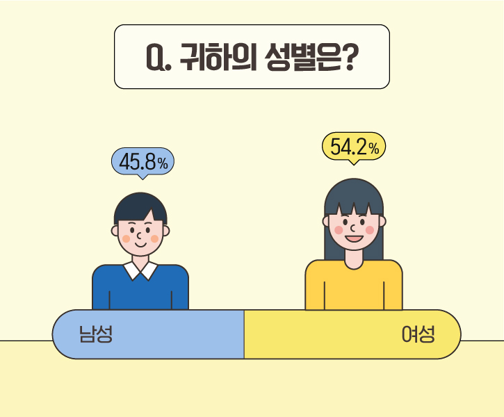 설문 참여자의 성비는 ‘남성’이 45.8%, ‘여성’이 54.2%로 여성 참여자의 비율이 다소 높은 모습입니다.
