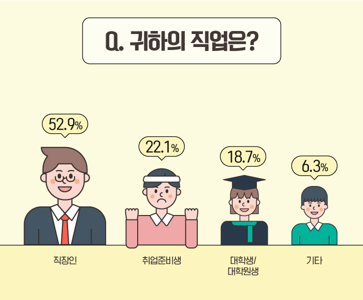 설문 참여자의 대다수는 ‘직장인’으로 52.9%를 기록했으며, ‘취업준비생’이 22.1%로 그 뒤를 이었습니다. 다음으로는 ‘대학생/대학원생’과 ‘기타’가 각각 18.7%, 6.3%로 집계됐습니다.