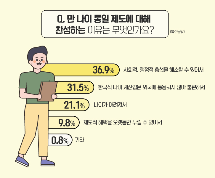 다음으로 ‘한국식 나이 계산법은 외국에 통용되지 않아 불편해서(31.5%)’가 근소한 차이로 2위를 차지했습니다. 이 외에도 ‘나이가 어려져서(21.1%),’ ‘제도적 혜택을 오랫동안 누릴 수 있어서(9.8%)’, ‘기타(0.8%)’ 등의 답변이 뒤를 이었습니다.