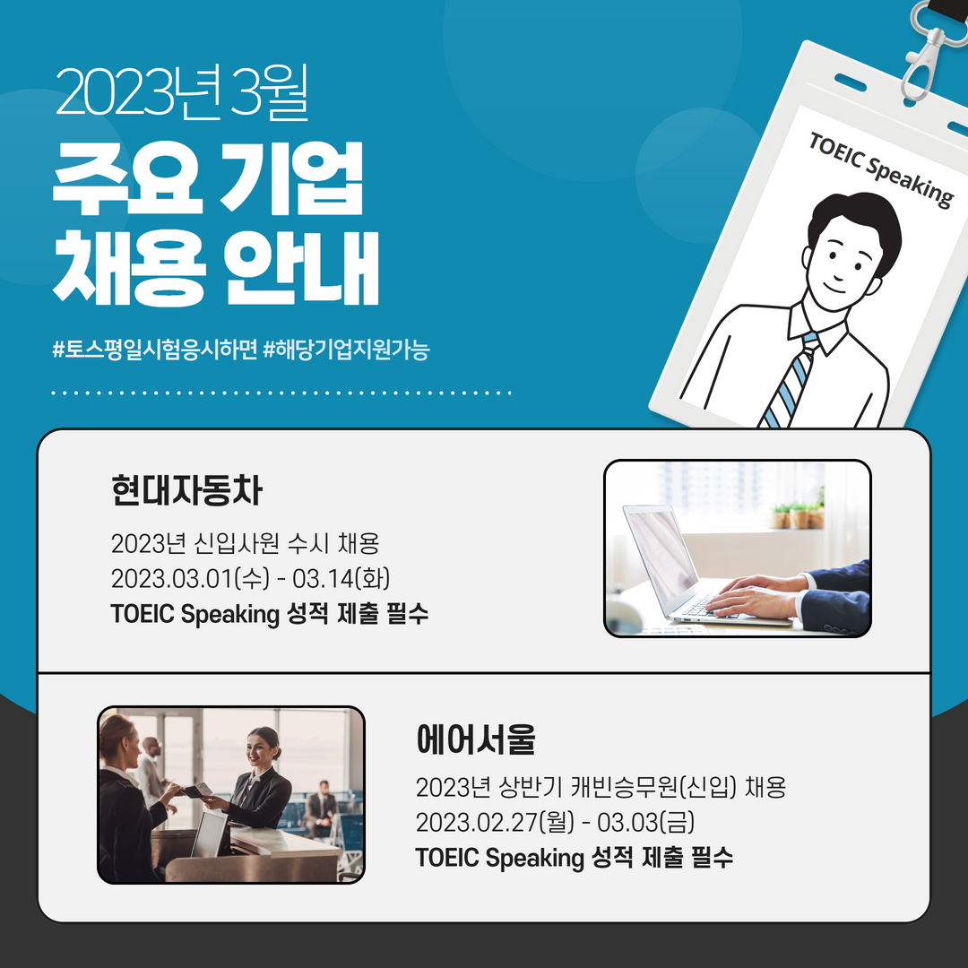 | 현대자동차 | 신입 | 3월 신입사원 수시 채용 | 3.14(화) 23:59 | TOEIC Speaking 성적 제출 필수 |