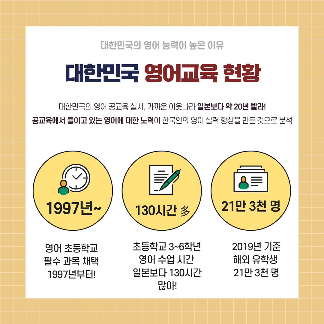 또한 초등학교 3~6학년 영어 수업 시간 분석 결과, 한국의 영어 수업 시간은 일본보다 130시간 많은 것으로 밝혀졌습니다. 언어에 있어서 조기 교육이 많은 영향을 끼치듯, 공교육에서 들이는 영어에 대한 노력이 한국의 영어 실력 향상을 만든 요인 중 하나로 판단됩니다.