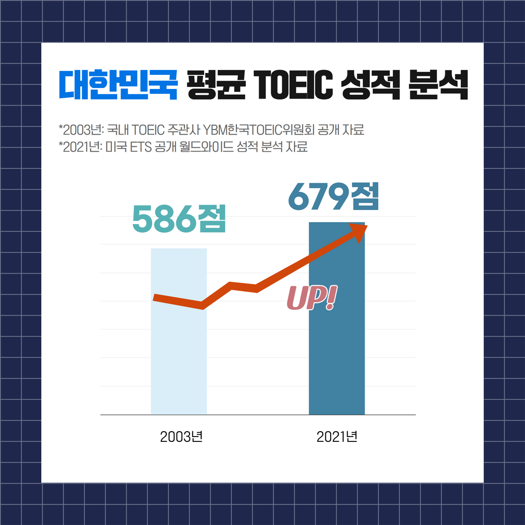 2003년 대한민국의 평균 토익 점수는 586점이었습니다. 약 18년 만에 평균 93점이 상승했는데요! 토익은 전 세계 160개 국가 약 14,000여개 기관에서 활용하고 있는 실용 영어 능력 시험입니다. 토익 평균 성적의 상승은 곧 영어 능력의 상승으로 볼 수 있습니다! 그렇다면 본론으로 들어가서, 대한민국의 영어 능력이 높은 이유는 무엇일까요? :)