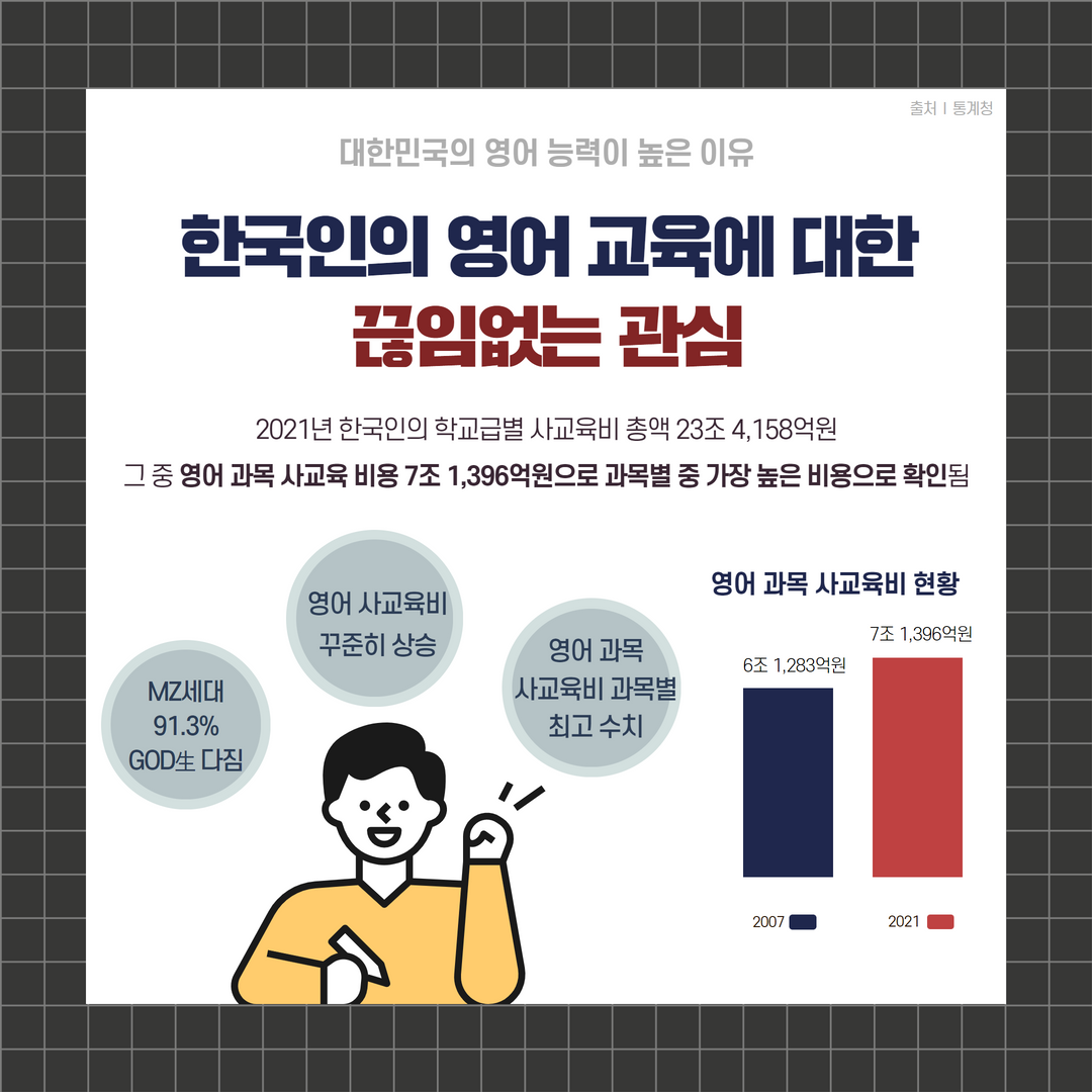 둘째, 한국인의 영어 교육에 대한 끊임없는 관심입니다. 한국은 사교육 열이 뜨거운 나라로 유명합니다. 통계청 자료에 따르면, 2007년 한국인의 학교급별 사교육비 총액은 20조 400억원이었습니다. 14년이 흐른 2021년에는 23조 4,158억원으로 약 16.8% 증가했는데요!