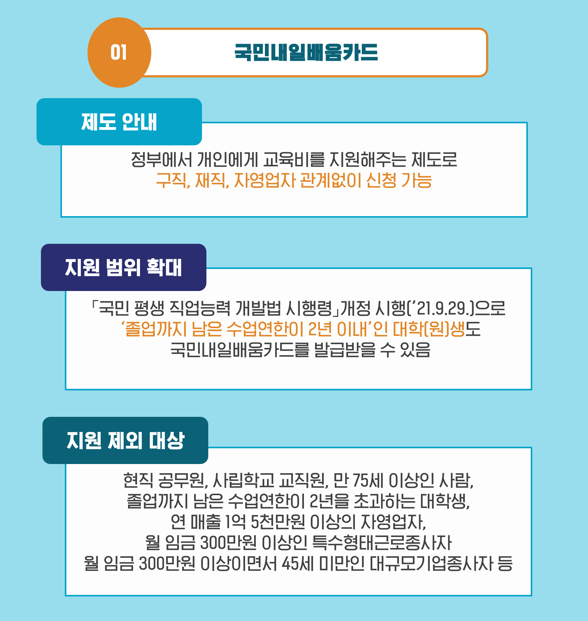 또한, 「국민 평생 직업능력 개발법 시행령」 개정 시행(’21.9.29.)으로, 지원 범위가 확대되었는데요. 카드 발급 대상이 대학생 중 ‘졸업예정자’에서 대학교 3학년 등으로 늘어났습니다. 따라서, 이제 ‘졸업까지 남은 수업연한이 2년 이내’인 대학(원)생도 국민내일배움카드를 발급받을 수 있게 됐습니다.