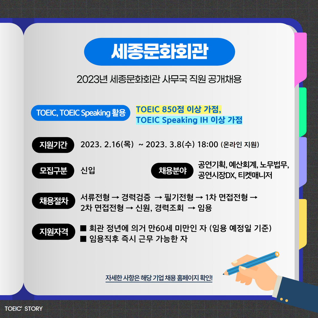 | 세종문화회관 | 신입 | 2023년 세종문화회관 사무직 직원 공개채용공고 | 3.8(수) 18:00 | TOEIC 850점 이상 가점, TOEIC Speaking IH 이상 가점 |