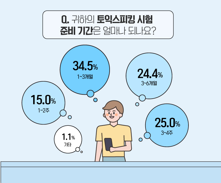 대부분의 수험자들이 빠르게는 3주 이상, 길게는 6개월 안으로 토익스피킹을 준비한다고 정리해볼 수 있겠네요. :)