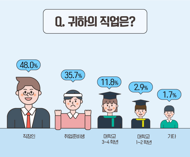 설문에 참여한 응답자 중 절반에 가까운 48%는 ‘직장인’으로 나타났습니다. ‘취업준비생(35.7%)’, ‘대학교 3~4학년(11.8%)’, ‘대학교 1~2학년(2.9%)’가 뒤를 이었으며, ‘기타(1.7%)’로 확인되었습니다.